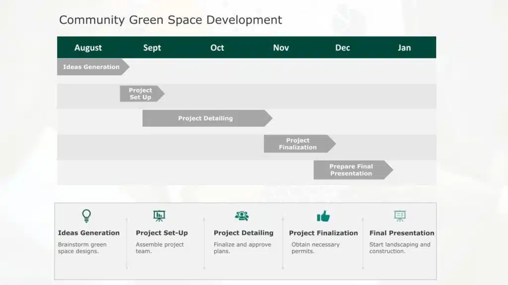 The timeline slide displays the six-month journey of the Community Green Space Development project. It starts with brainstorming design ideas in August and moves through team formation, plan approval, permit acquisition, and construction, concluding with the project’s completion and opening in January.