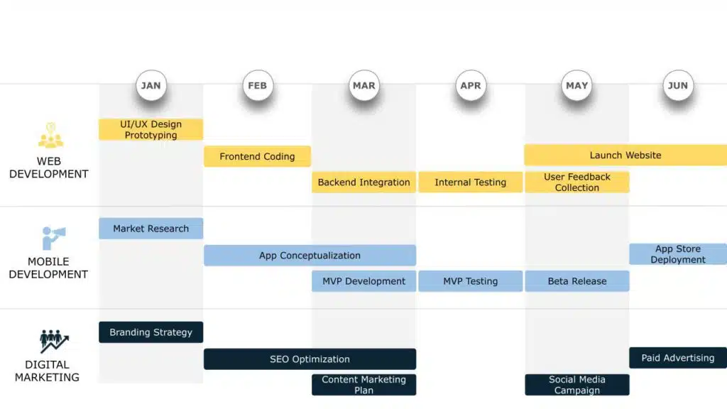 The slide outlines a strategic action plan for a tech startup’s web development, mobile development, and digital marketing operations over six months. Each vertical—Web Development, Mobile Development, and Digital Marketing—is aligned with monthly targets leading up to significant deliverables, such as the website launch and the mobile app deployment. The timeline is a visual roadmap designed to guide the team through each development and marketing phase, ensuring a synchronized launch of their digital products.