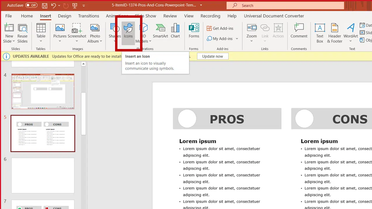 Step 4: Add icons – Insert > iconsStep 5: Make necessary adjustments as per your requirements and save the presentation.