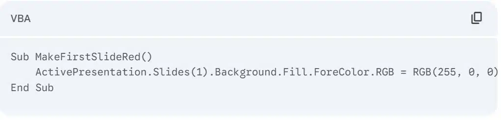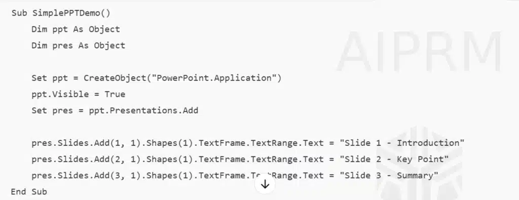 Great! Now that we have the code!, Let’s run it in the VBA Editor in powerpoint! Simply copy it for now. A quick tip, you can also create a VBA code using AI. You can ask ChatGPT to create a VBA code describing the kind of resultant presentation you want (something beyond the scope of this blog, but is discussed in this blog, ‘How to use ChatGPT to create a PowerPoint presentation?). You can check our YouTube tutorial on how to create a PPT using ChatGPT here.
