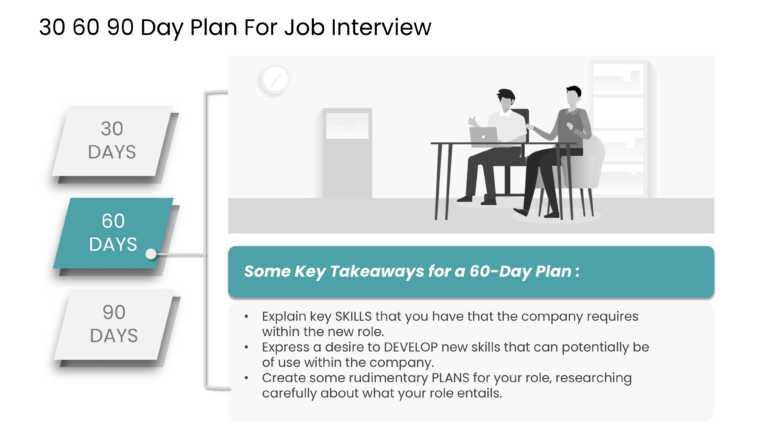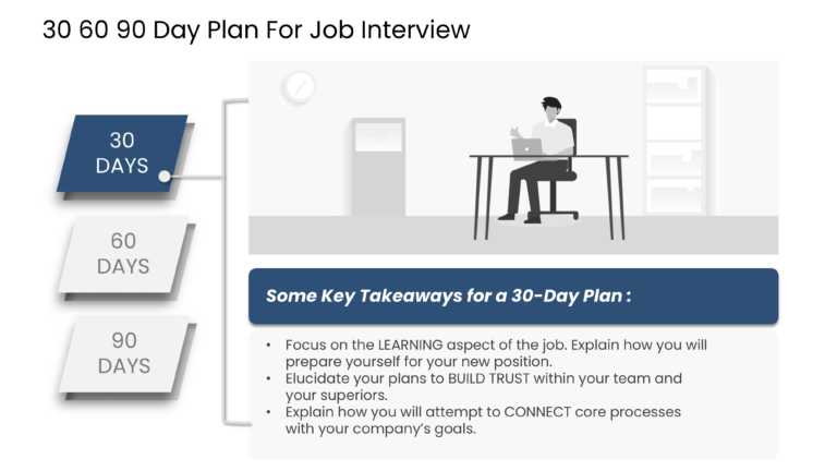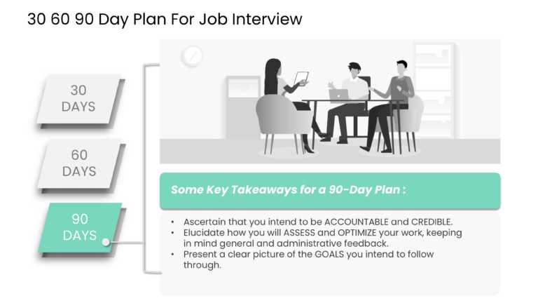 This is primarily tailored for individuals preparing for job interviews to demonstrate their roadmap for success in a role. This 30 60 90 PowerPoint template caters to job seekers, newly onboarded employees, and anyone outlining their strategic approach to seamlessly transitioning into a new position. These professional slides are easily customizable, enabling users to tweak text, fonts, and colors according to their requirements. They are also fully compatible with both PowerPoint and Google Slides, giving users the flexibility to present their plans in their own settings.