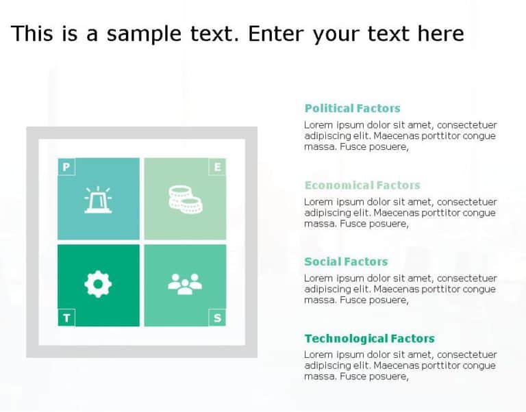 Capture your audience’s attention right from the start with this visually appealing template designed for PEST analysis. This presentation tool features a refreshing mint green color scheme that not only enhances visual appeal but also keeps your audience engaged throughout your business strategy discussions.